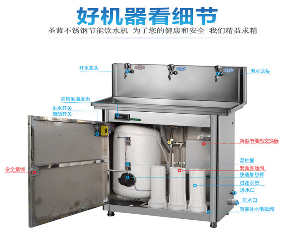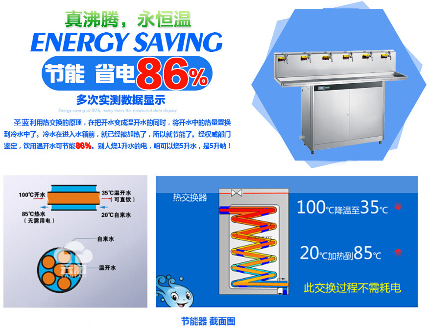 圣蓝不锈钢直饮机采用热能交换技术,烧开过的水经热交换内管流动被热交换器外管冷水自然吸热升温,热水降温成温开水,同等条件下饮用温开水节省用电86%